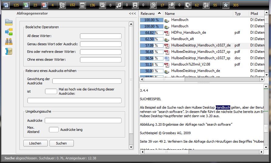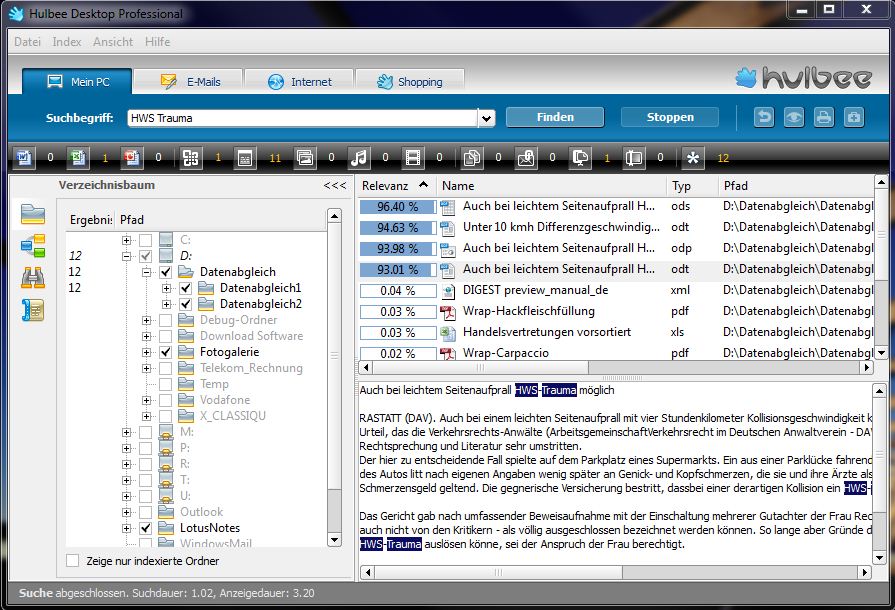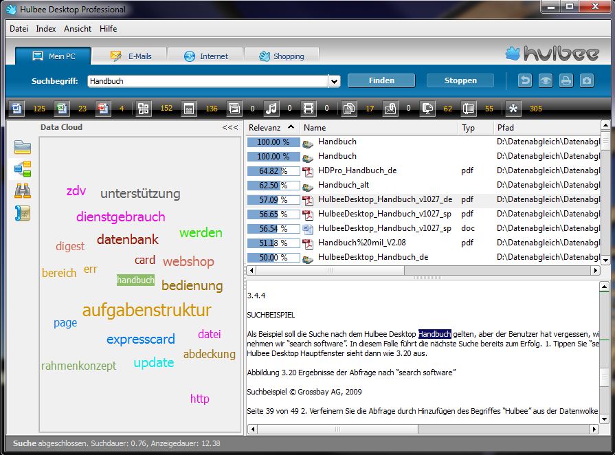 Furthermore, Hulbee Desktop PRO has a major advantage over the competition, since it auto-matically generates a data cloud (DataCloud), which presents associations to the search term (for examples invoices) and displays related terms, for example “RWE” or “Telekom”. This pro-cess replicates human thinking and suggests suitable related items by itself. We hope you will have fun with this unique and intelligent search engine.