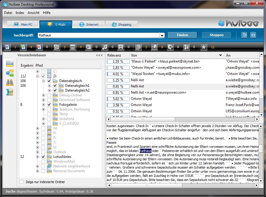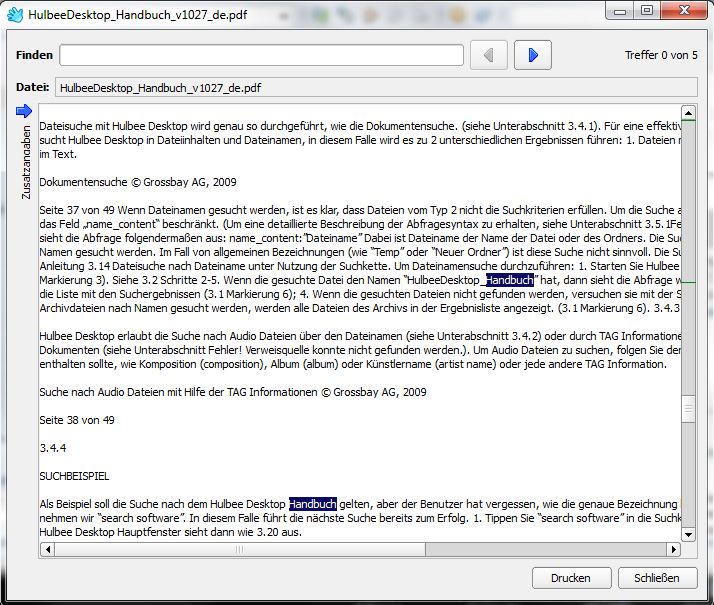 Hulbee Desktop PRO is flexible and adaptable to the needs of a company just like a lego system. Even in its basic version the software can search through enormous amounts of data, even if the search is carried out in networks or servers. Archived data and external storage media can be searched in just the same way as the personal USB stick of the user. The user can create any kind of index and also move them to different places. If, for example, the computer is connected to three hard drives, the relevant index can be moved to the corresponding hard drive and be maintained.